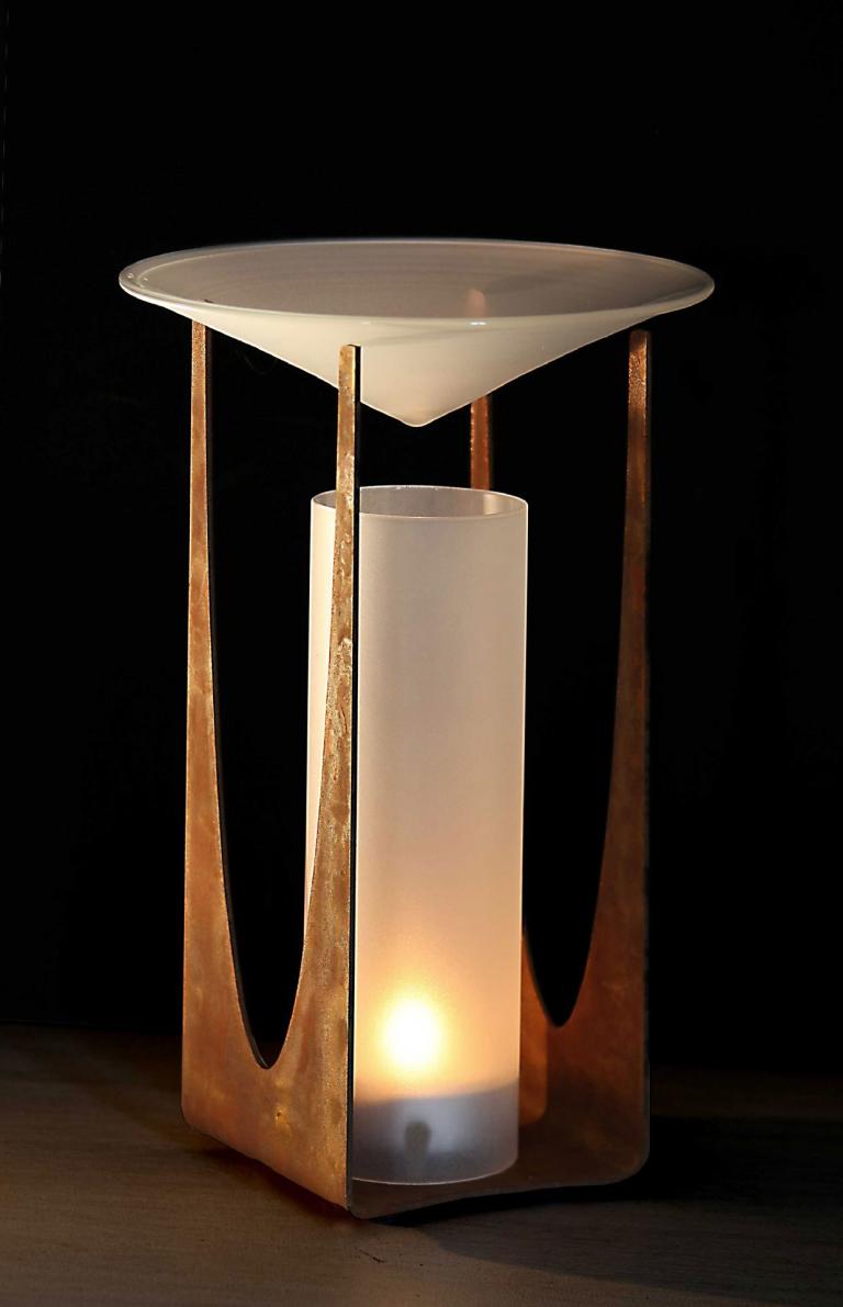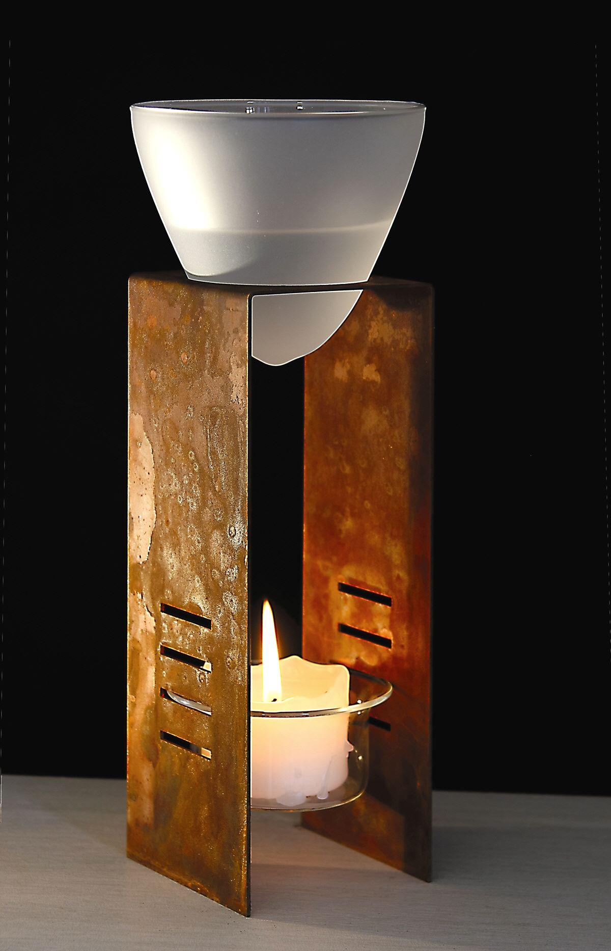 duftleuchte für teelichter und aromaöle/-essenzen, auch ohne duftessenz ein schönes tisch-windlicht aus cortenstahl und sattiniertem glas