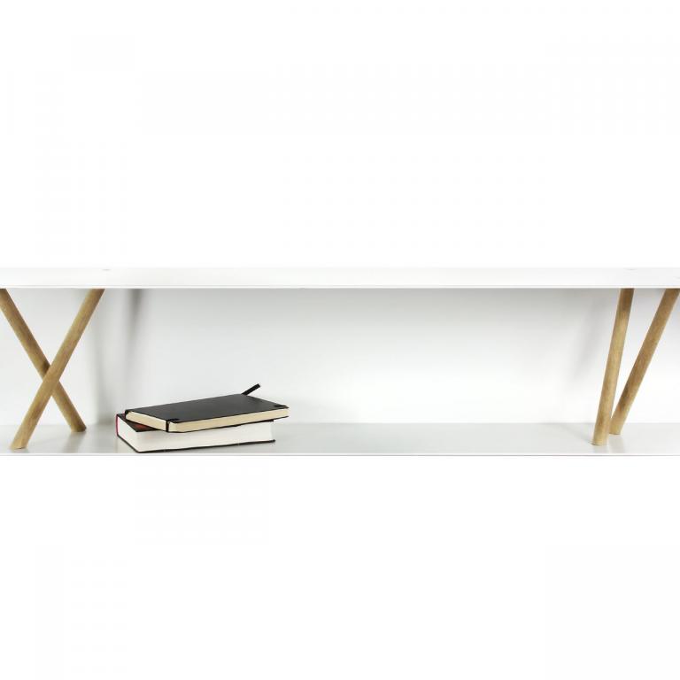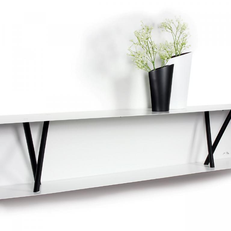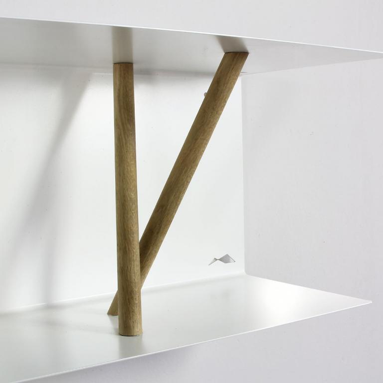 Bei diesem Metallwandregal wird ein lasergeschnittenes Metallblech gekantet in eine U-Form gebracht, pulverbeschichtet. Holzstäbe werden eingespannt, dienen als unaufdringliche Stützen für Bücher.