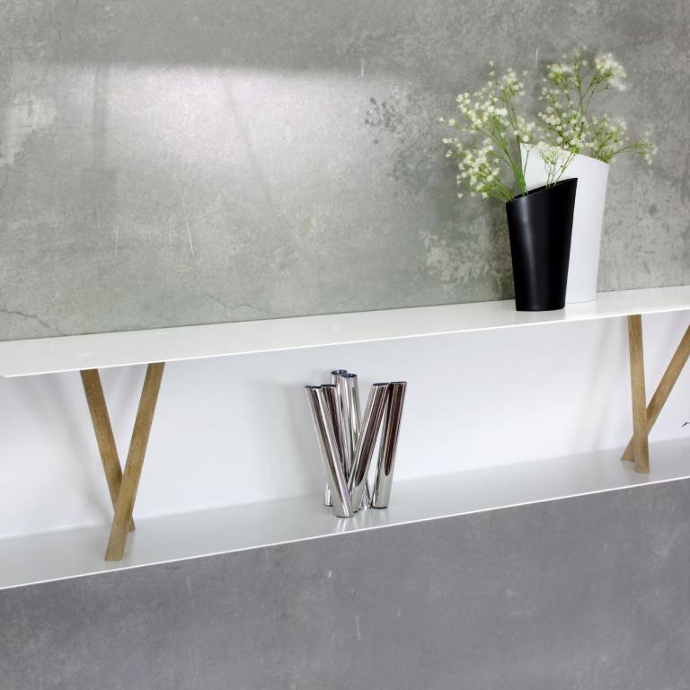 wandregal aus fein weiß pulverbeschichtetem metall, mit eichen- oder buchenholz, maße ca.22 x 25 x 134 cm