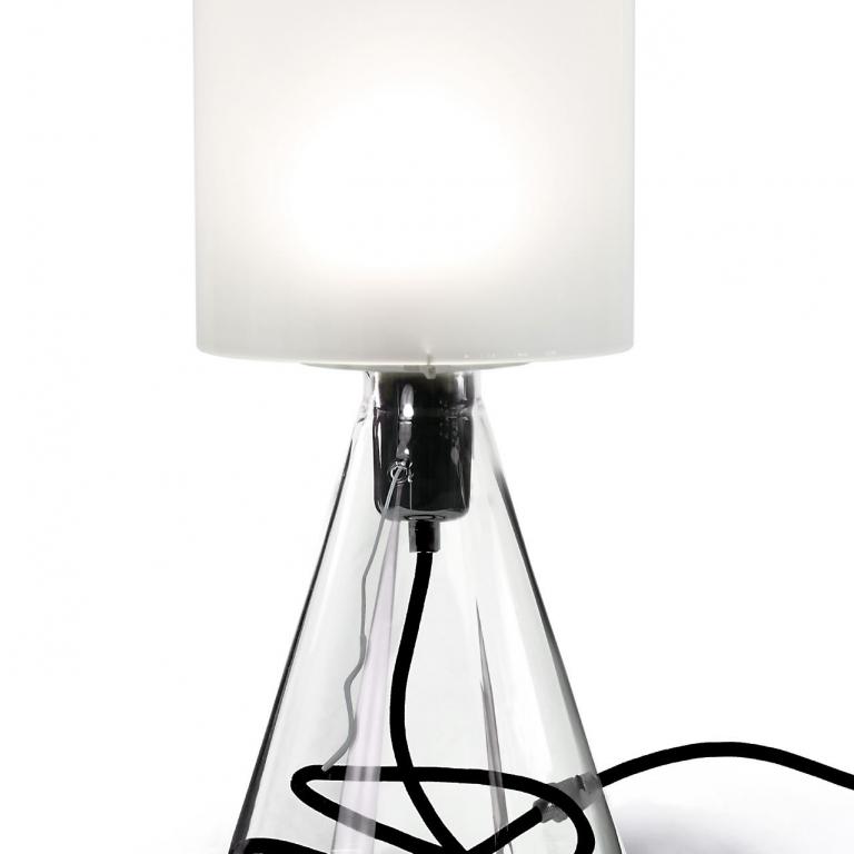 eine lampe im stil der Klassischen Moderne, mundgeblasen aus besonders klarem borosilikatglas für moderne leuchtmittel wie led, überschüssiges kabel kann in den standfuß geschoben werden, ca. 39 x 20 cm