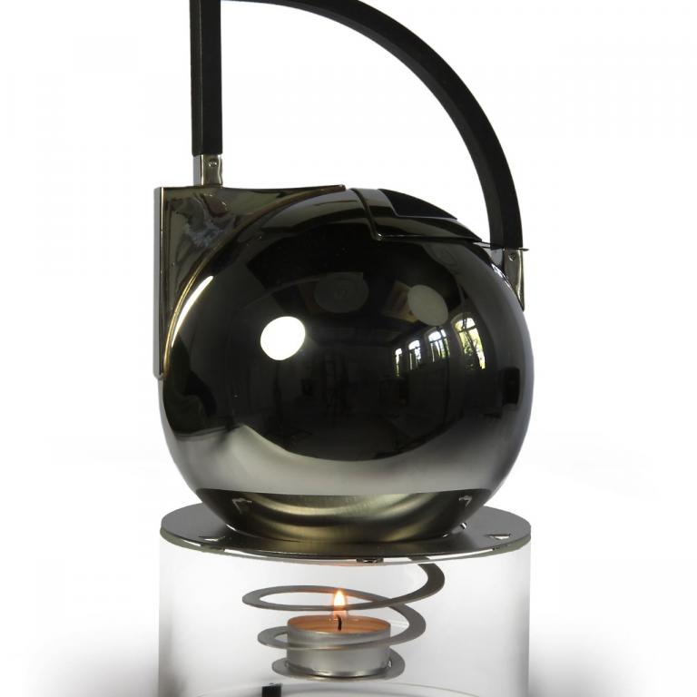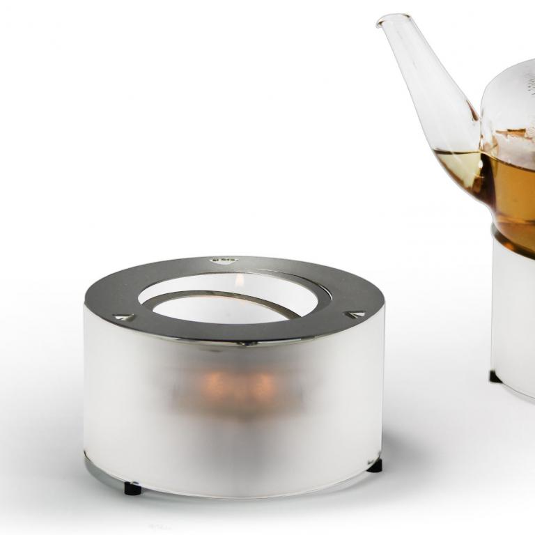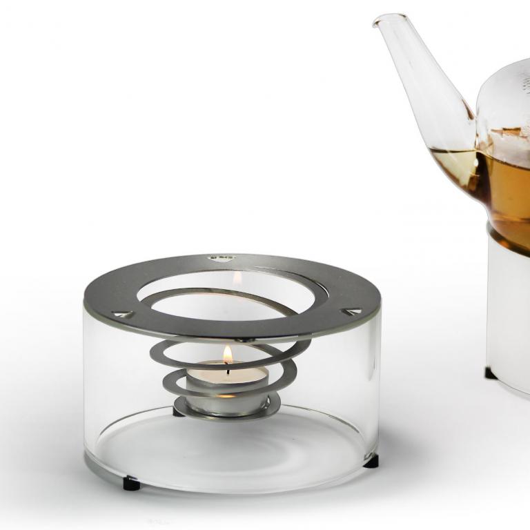Ein in eine gedehnte Edelstahlspirale eingesetztes Teelicht normaler Größe erzeugt die nötige Wärme, um den Tee in einer Teekanne warmzuhalten. Dabei schirmt ein Glaszylinder aus hitzebeständigem, wahlweise klare oder mattiertem Borosilikatglas das Teelicht vor Zugluft ab, sorgt für die nötige Hitze und lässt es in einem weichen Licht erscheinen.