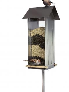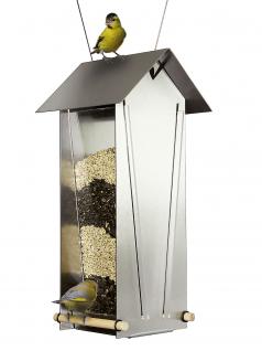 Edelstahl-Vogelhaus zum Hängen mit großem Futterdepot. Hinter Acrylscheiben bleibt das Vogelfutter sichtbar, besonders reizvoll mit schichtweise eingefüllten, verschiedenen Vogelfuttersorten.