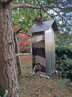 Im Unterschied zu diesen haben wir allerdings auf ein Dach aus Schiefer verzichtet. Das Dach aus Edelstahl lässt sich hier zum Befüllen dieser hängenden Futterstelle von oben leicht abnehmen und wieder aufsetzen.