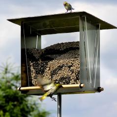 Mit einem Füllvolumen von über 7,5 Litern (ausreichend für ca. 3 kg Sonnenblumenkerne) ist für einen guten Vorrat an Futter gesorgt. Zum Nachfüllen wird das schräg aufgesetzte Schieferdach einfach abgenommen.