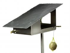 Ansonsten ist es identisch mit unserem VH-6 mit einemschrägen Dach aus Schiefer und einem puristischen Grundkörper aus Edelstahl, nur proportional vergrößert. Auch hier können Sie einen selbst gesuchten (oder unten bestellten) Ast als natürliche Landehilfe einstecken und einen Meisenknödel aufhängen.