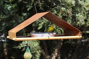 Die Größe des Vogelhauses erlaubt es, neben einer Porzellanschale auch ein weiteres flaches Gefäß wie eine tiefe Untertasse als Tränke aufzustellen.