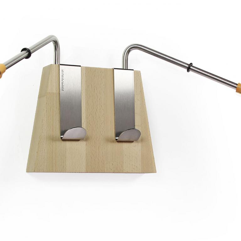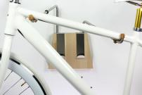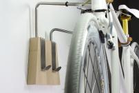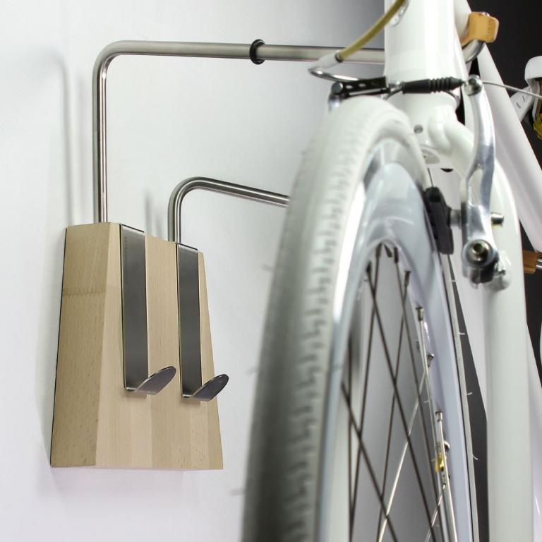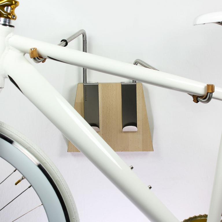 Dieser Fahrradhalter ist in Funktion und Design gleichzusetzen mit unserer Fahrradwandhalterung Bull, nur dass hier das Holzteil horizontal gespiegelt ist.