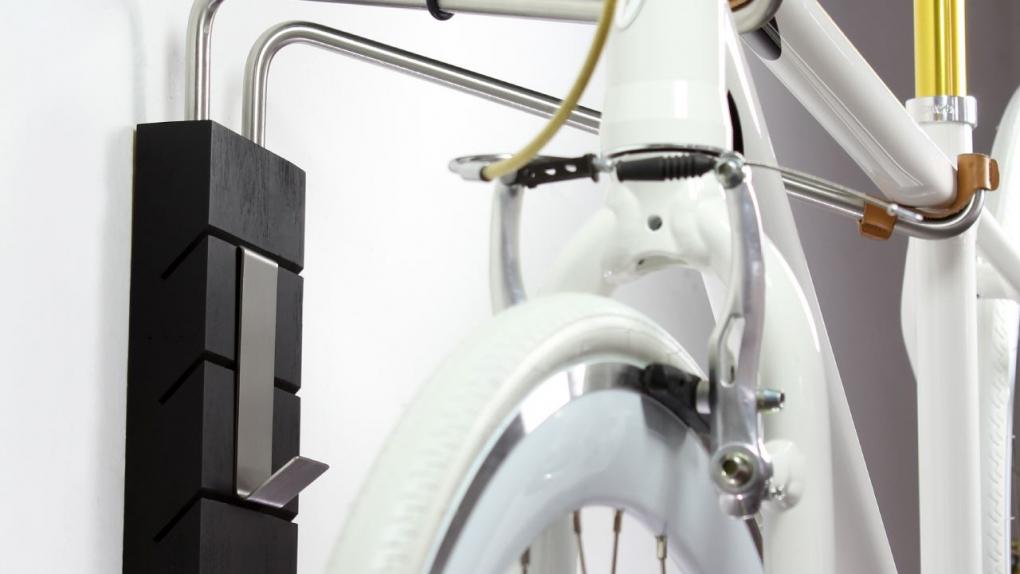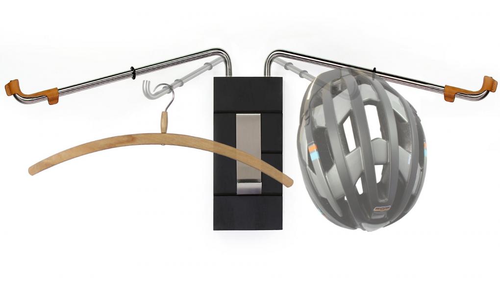 Mit Kleiderbügeln bestückt, kann dieser Fahrradwandhalter als Wandgarderobe genutzt werde