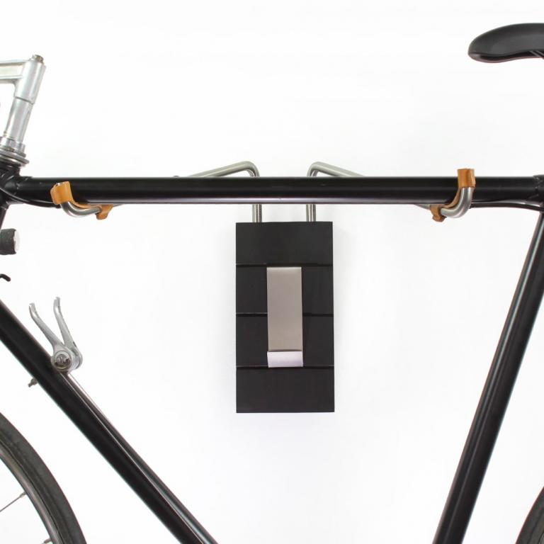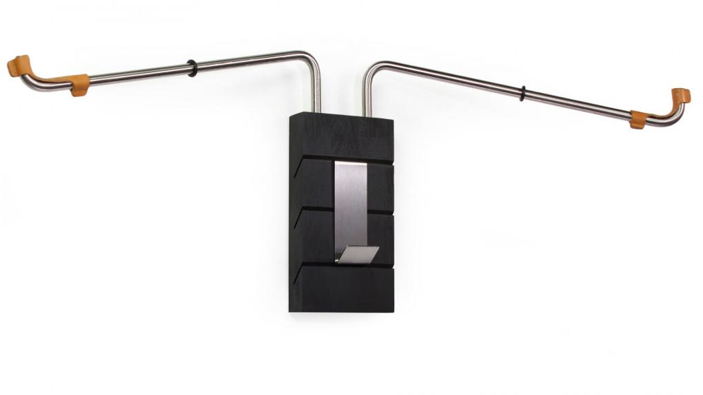 Im Gegensatz zu unseren anderen Wandhalterungen ist das Holzteil in Rechteckform ausgebildet und mit 3 Querschlitzen unterteilt. Diese dienen einerseits zur Aufnahme von Wohnungs- oder Fahrradschlüssel, andererseits lassen sich hier die Arme in 3 verschiedenen Höhen verstellen. Eine Münze einfach in den entsprechenden Schlitz der Fahrradhalterung gesteckt und schon ist der Arm in der Höhe arrettiert.