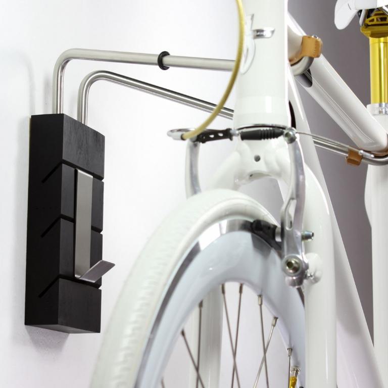 Der Haken verdeckt die Wandbefestigung. An ihm finden Fahrradhelm, Taschen oder Fahrradschlösser Platz.