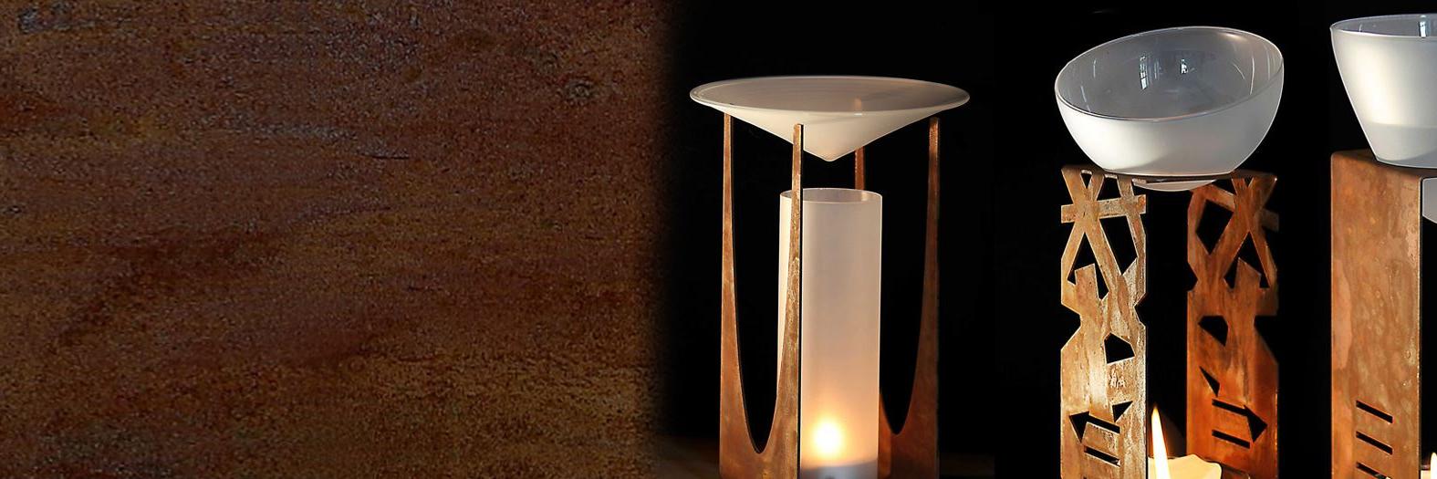 duftleuchte für teelichter und aromaöle/-essenzen, auch ohne duftessenz ein schönes tisch-windlicht aus cortenstahl und sattiniertem glas