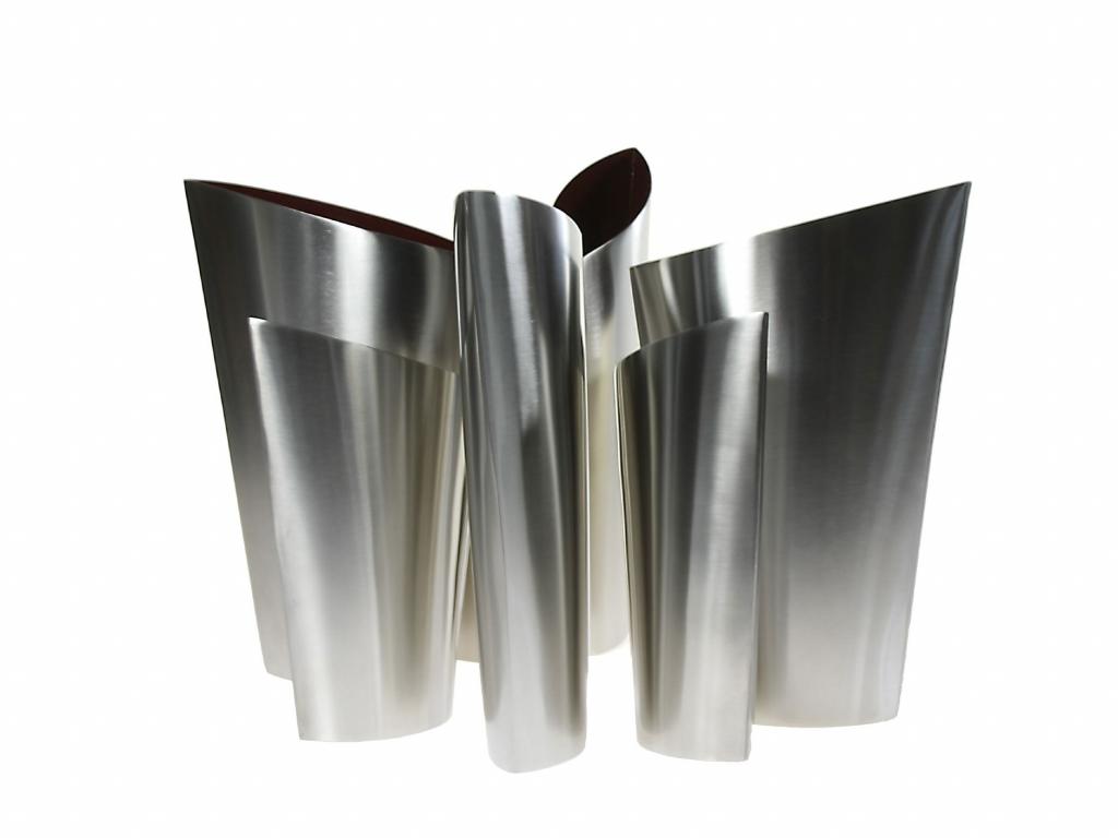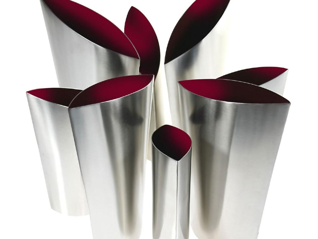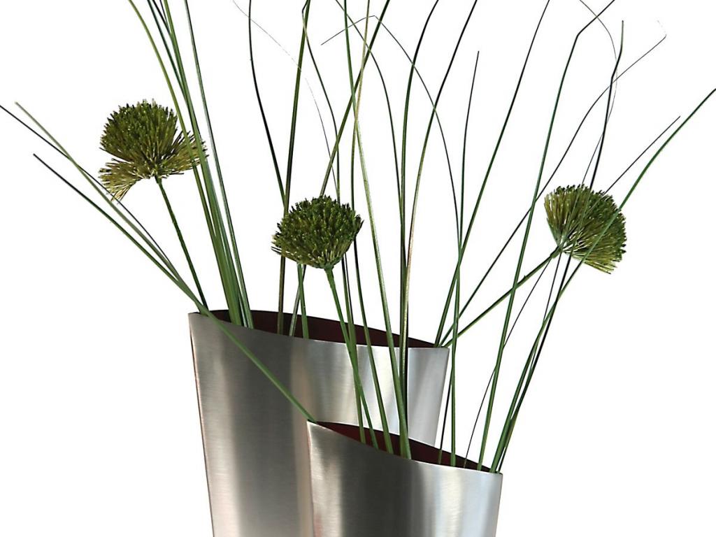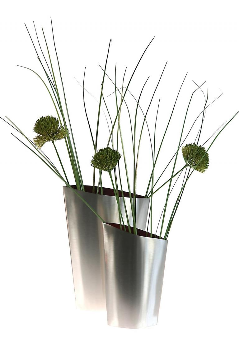 Ein Blatt stand Pate bei der Gestaltung, von oben zu erkennen. Dieses Vasen-Set besteht aus 2 flachen Vasen aus gebürstetem Edelstah oder in schwarz-weißer Lackierung