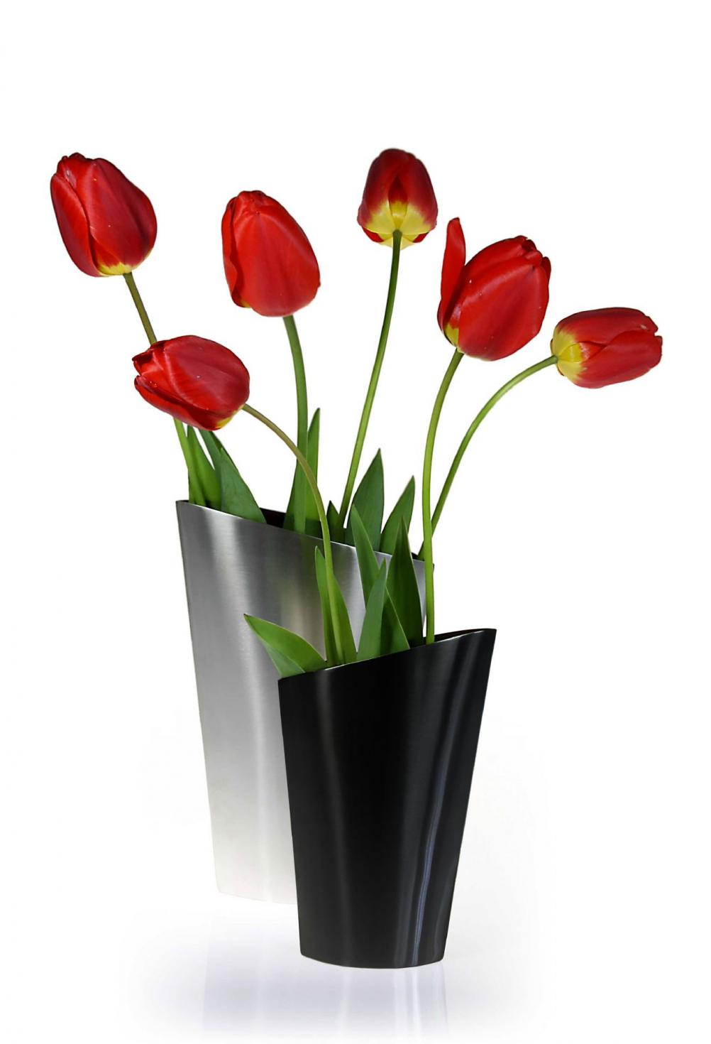 Ein Blatt stand Pate bei der Gestaltung, von oben leicht zu erkennen. Dieses Vasen-Set besteht aus 2 flachen Vasen aus gebürstetem  Edelstah oder in  schwarz-weißer Lackierung, mit einem verstärkten Boden für einen sicheren Stand