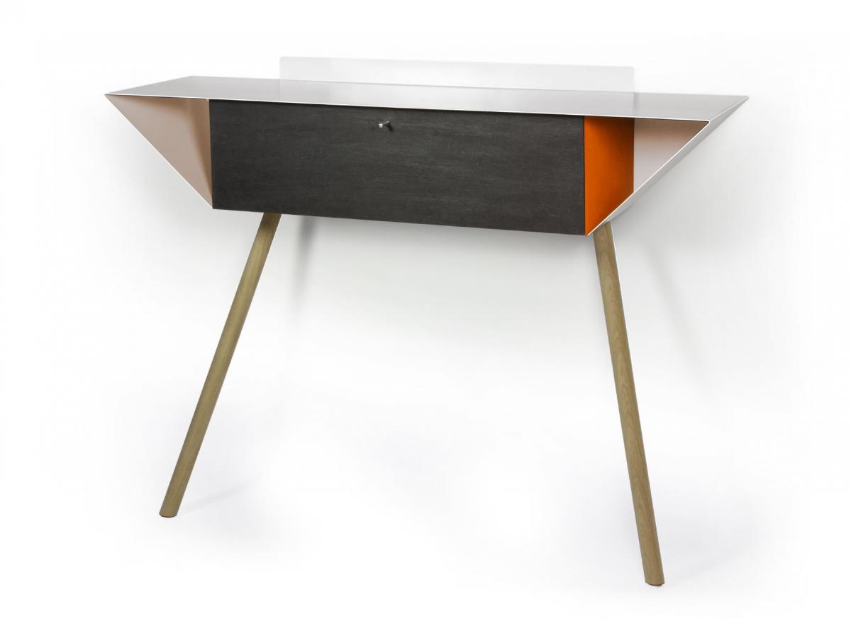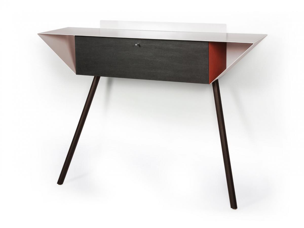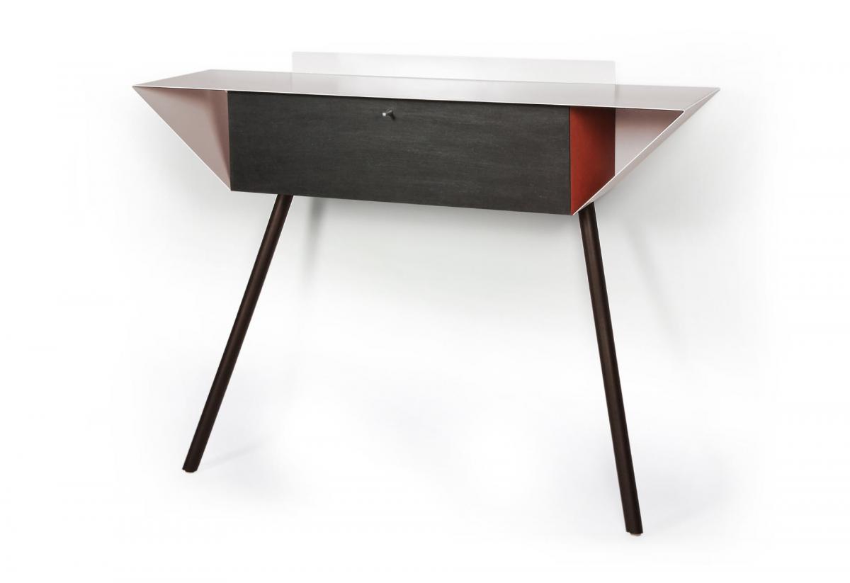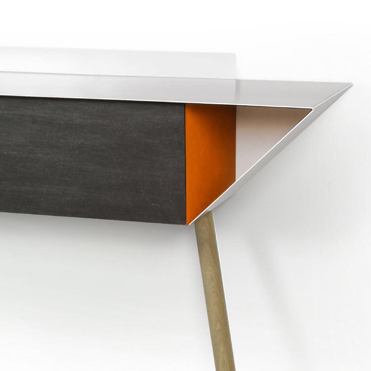 Ein Anlehnschrank aus gewachstem schwarzen MDF. Das Besondere: die Seitenteile sind farbig rot, blau oder orange abgesetzt.
