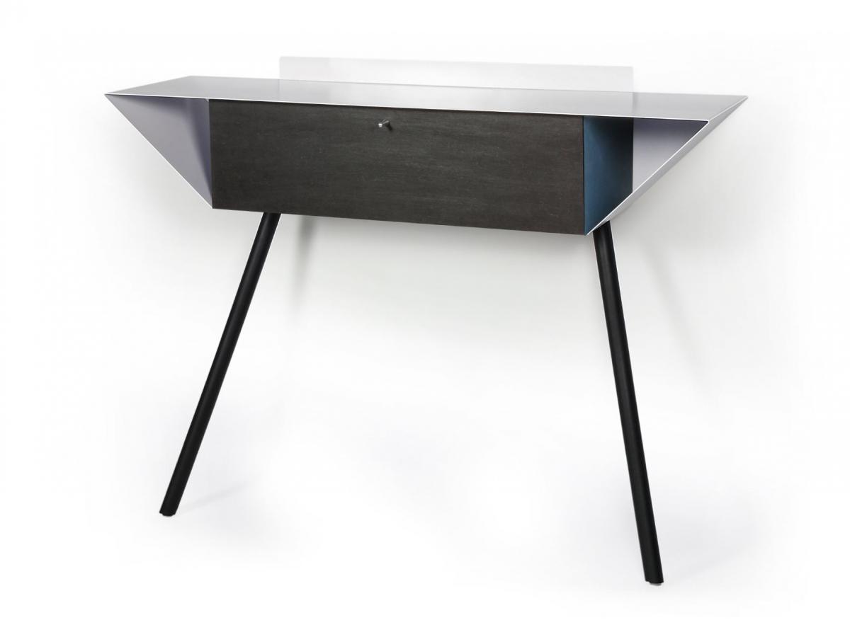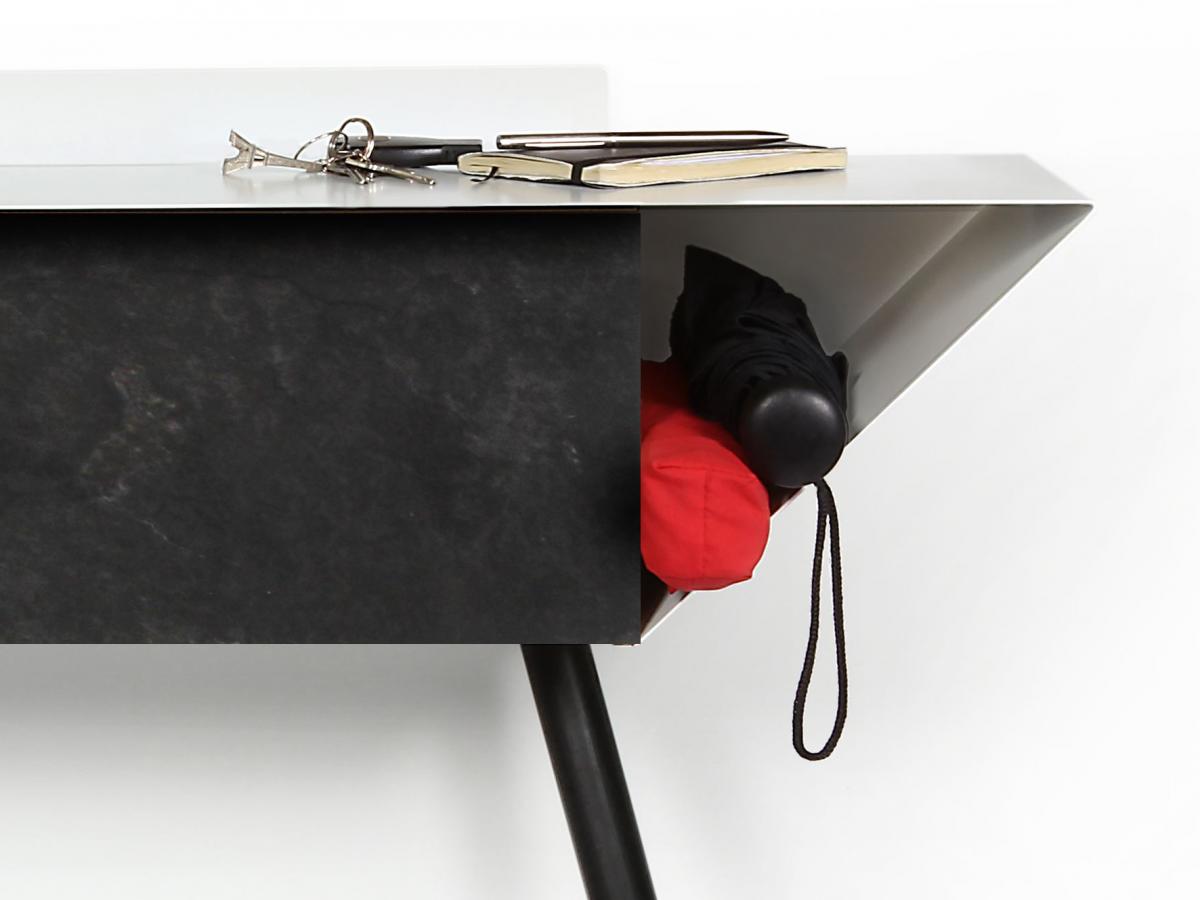 anlehnschrank/sideboard/kommode aus fein weiß pulverbeschichtetem metall, klappe aus schwarz durchgefärbtem MDF, seitenteile farblich abgesetzt, mit füßen in eichenholz, zusätzliches anschrauben möglich, maße 100 x 25 x H 75 cm