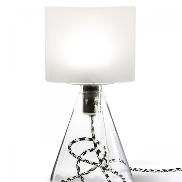 Transparentes oder farbiges Textilkabel liegt sichtbar im klaren Lampenfuß gerollt. Überschüssiges Kabel wird in den Leuchtenfuss geschoben und so zum gestalterischen Element.