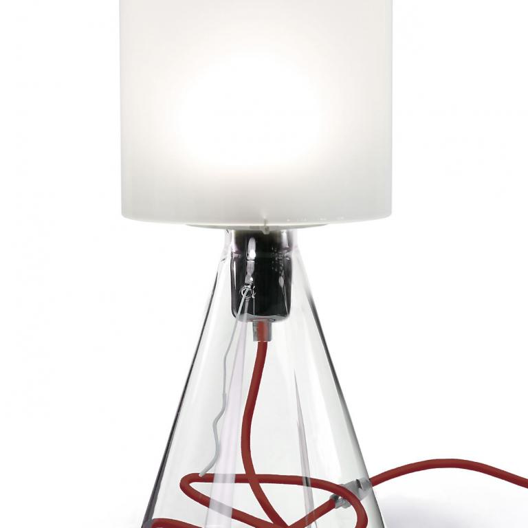 eine lampe im stil der Klassischen Moderne, mundgeblasen aus besonders klarem borosilikatglas für moderne leuchtmittel wie led, überschüssiges kabel kann in den standfuß geschoben werden, ca. 39 x 20 cm