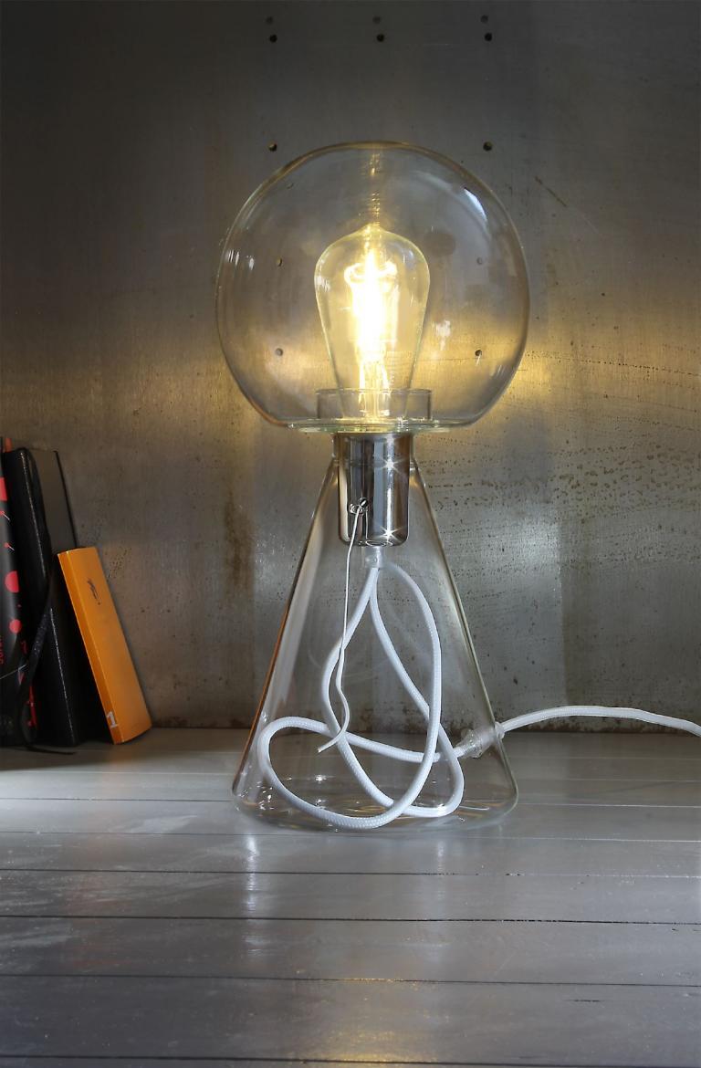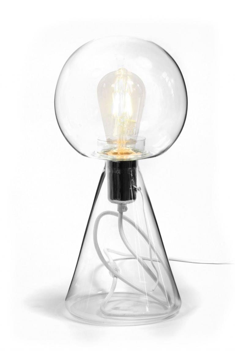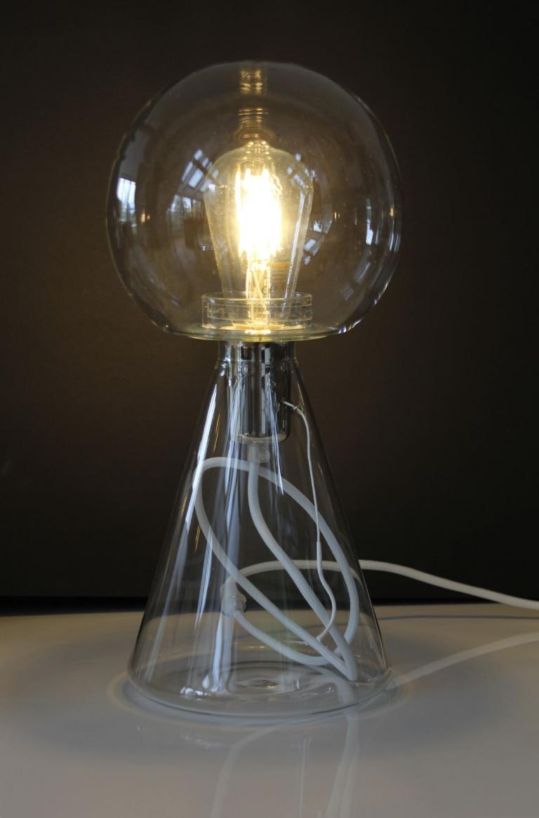 Auf einem kegelförmigen Glaskörper ruht eine Halbkugel aus klarem Glas, hinter der eine moderne LED in der Optik einer klassischen Glühfadenlampe ihre Leuchtkraft erstrahlen lässt.