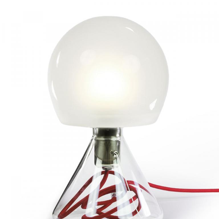 Transparentes oder farbiges Textilkabel liegt sichtbar im klaren Lampenfuß gerollt. Überschüssiges Kabel wird in den Leuchtenfuss geschoben und so zum gestalterischen Element.