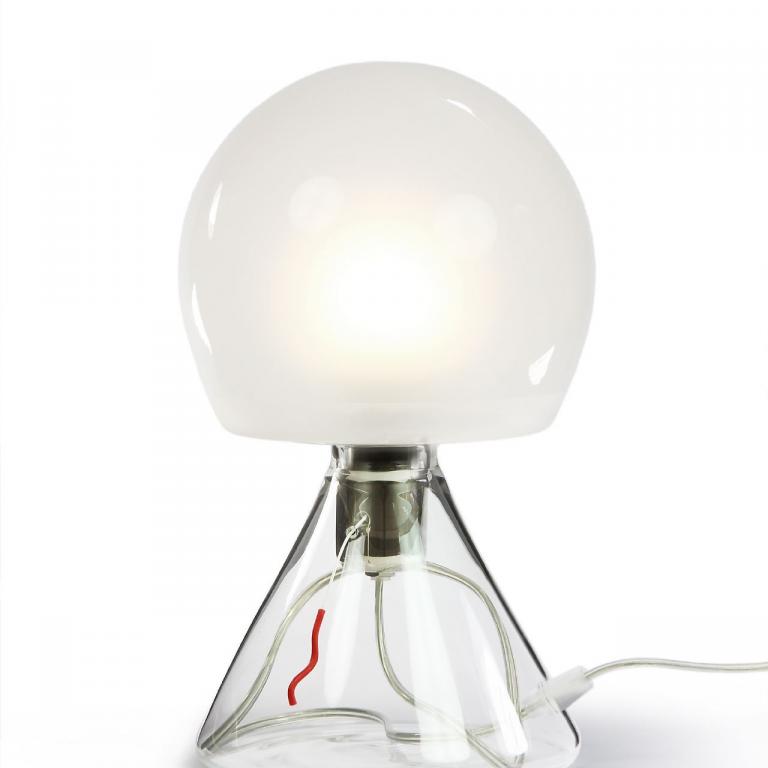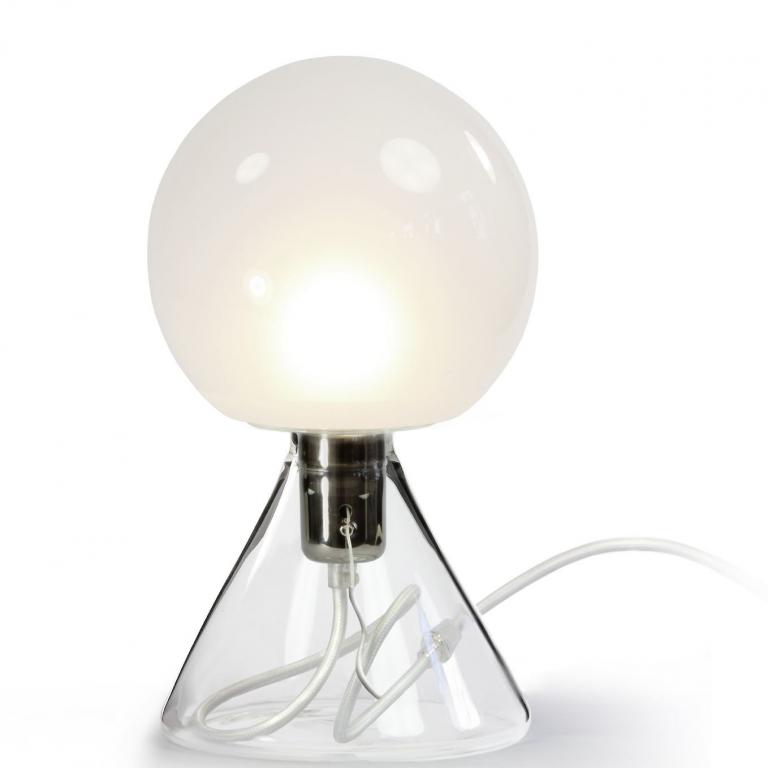 eine lampe im stil der Klassischen Moderne, mundgeblasen aus besonders klarem borosilikatglas für moderne leuchtmittel wie led, überschüssiges kabel kann in den standfuß geschoben werden, ca. 32 x 18 cm