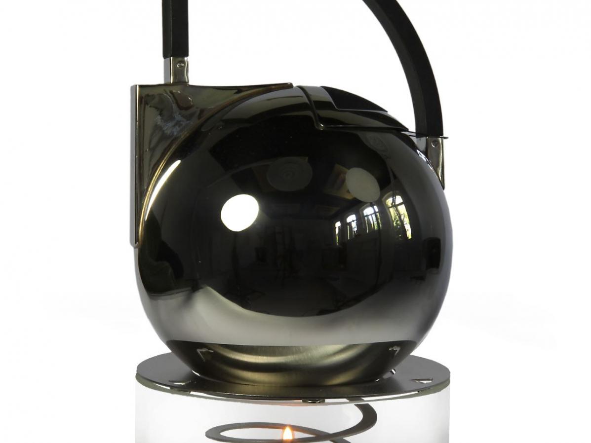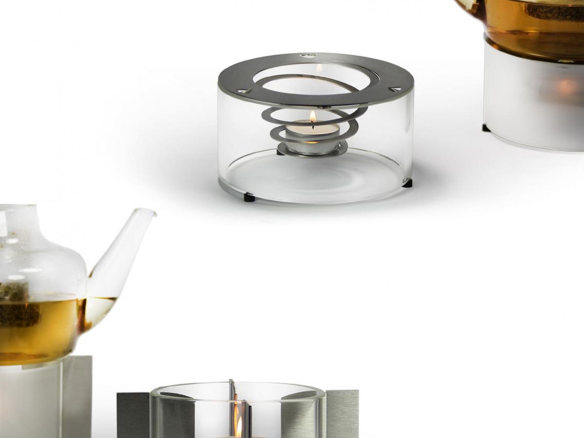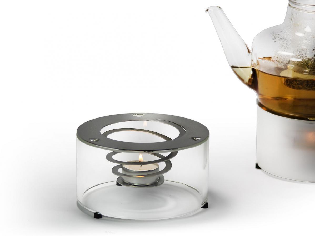 Ein in eine gedehnte Edelstahlspirale eingesetztes Teelicht normaler Größe erzeugt die nötige Wärme, um den Tee in einer Teekanne warmzuhalten. Dabei schirmt ein Glaszylinder aus hitzebeständigem, wahlweise klare oder mattiertem Borosilikatglas das Teelicht vor Zugluft ab, sorgt für die nötige Hitze und lässt es in einem weichen Licht erscheinen.