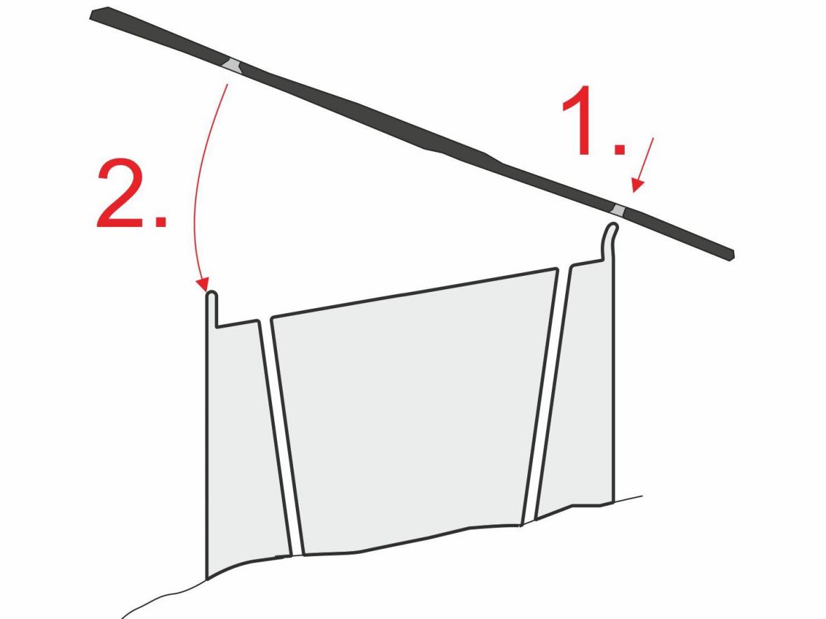 Zuerst wird der Schiefer auf den oberen Steg aufgesetzt, dann auf die unteren zwei Stege nach unten geklappt. Dabei verklemmt sich der Schiefer, bleibt windunanfälliger.