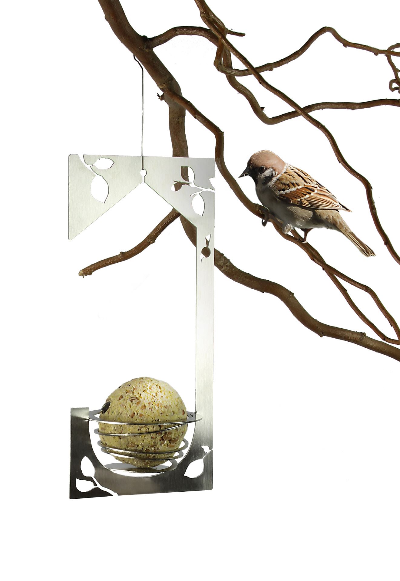 Meisenknödel-Halter in Edelstahl, flach zum Verschicken als Brief oder bereis vorgebogen. In den Varianten BallHouse und LEAF.