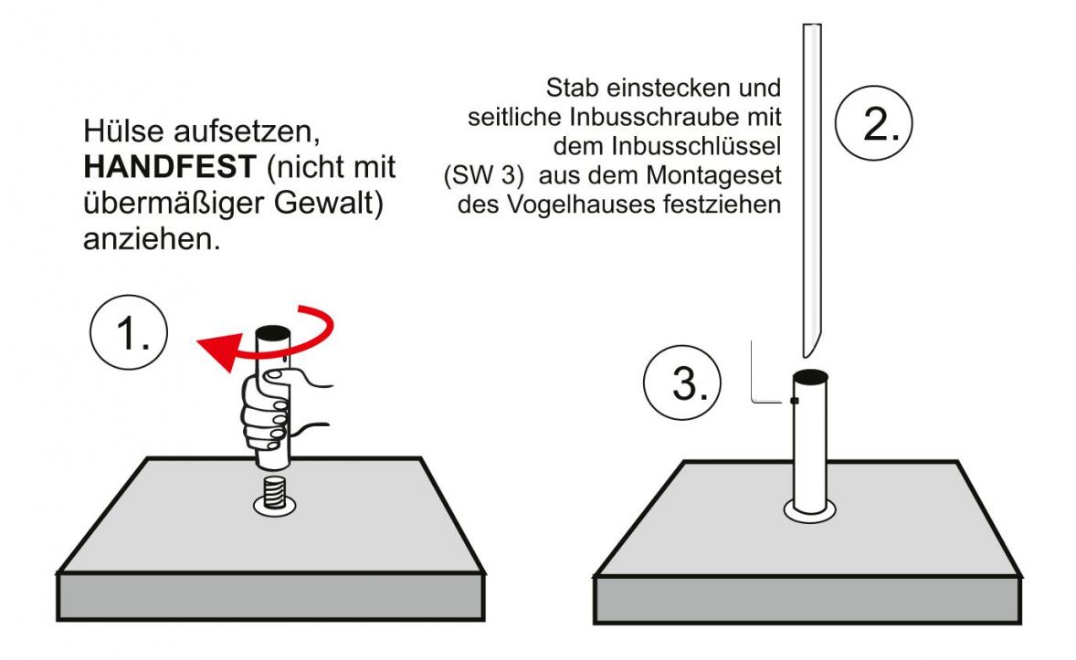 Eine beigefügte Edelstahlhülse wird auf den Beton- bzw. Edelstahlfuß geschraubt, anschließend der Stab des Vogelhauses eingesteckt und mit einer seitlichen Inbusschraube in der Hülse fixiert.