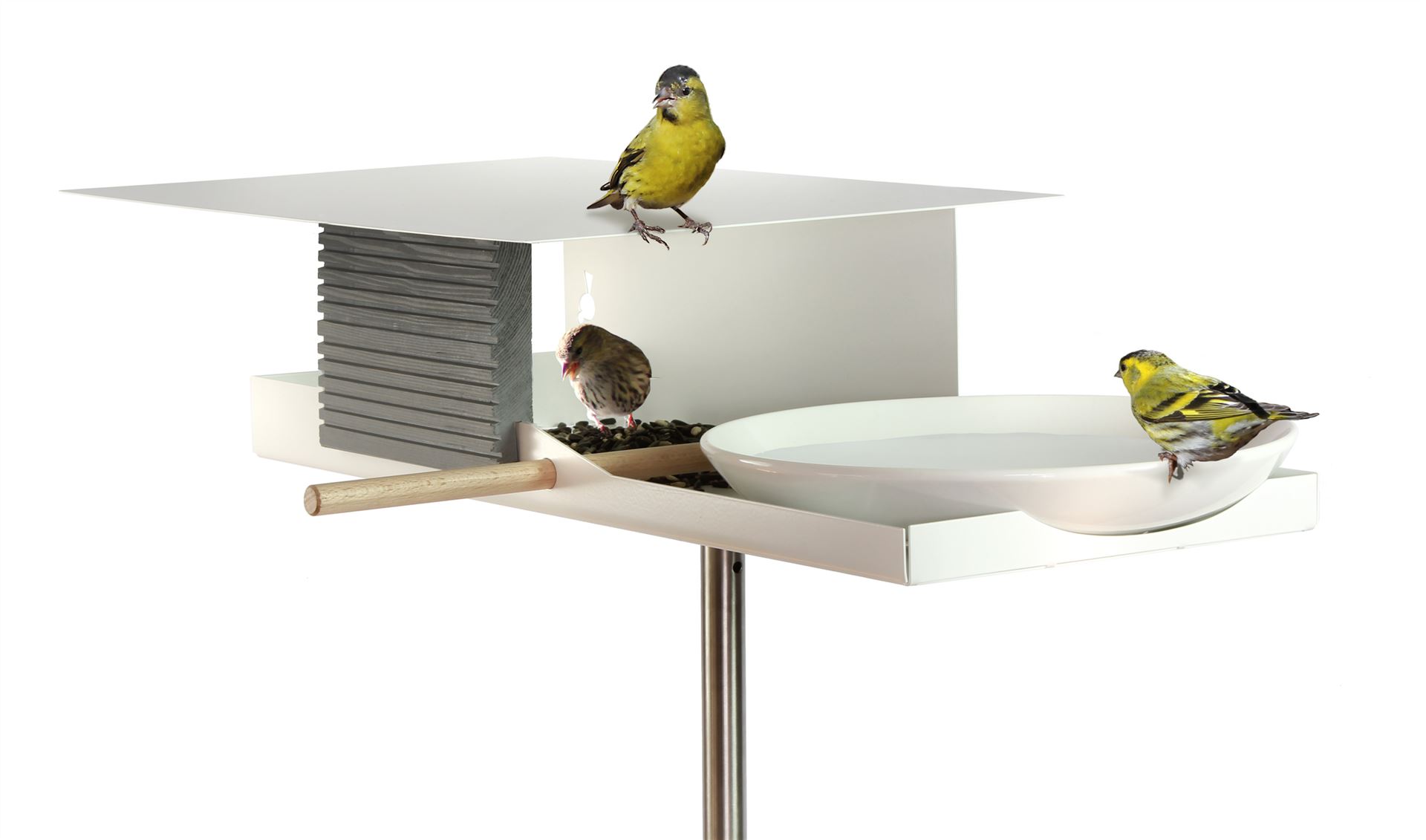 Kombination aus Vogelhaus und Vogeltränke in Edelstahl in weiß pulverbeschichtetem Edelstahl in modernem Design