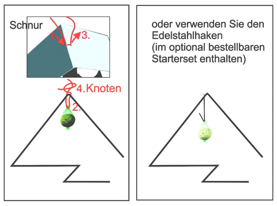 Mittig lässt sich ein Meisenknödel einhängen. Dafür sind im Dachbereich zwei kleine Aussparungen. Verwenden Sie dazu eine dünne Schnur oder den Edelstahlhaken, der dem optional erhältlichen Starterset beiliegt.