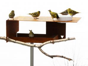 Der Cortenstahl bildet bei dieser Futterstelle eine dekorative Rostschicht aus, die zugleich als Schutzschicht wirkt, ein Weiterrosten verhindert und vor einer weiteren Durchrostung schützt. Sie finden dieses Material insbesondere bei repräsentativen Bauten in moderner Architektur.