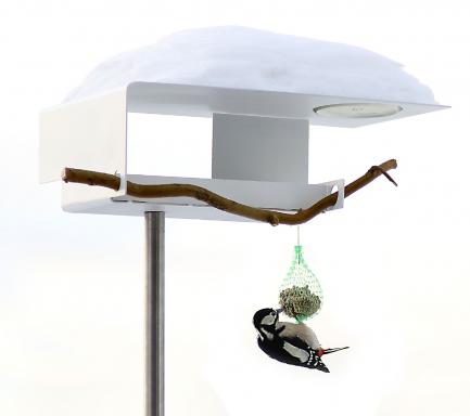 Ein kombiniertes Vogelfutterhaus mit Porzellantränke im Bauhausstil aus pulverbeschichtetem Aluminium, inklusive Edelstahlstab. In Dunkelgrau oder wie hier in Weiß