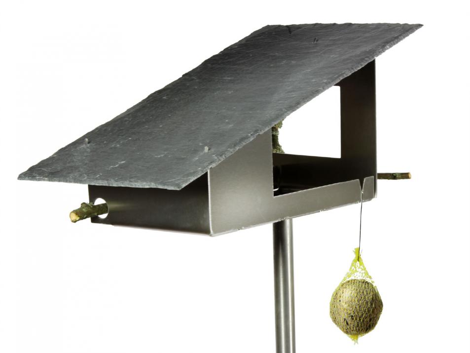 Ansonsten ist es identisch mit unserem VH-6 mit einemschrägen Dach aus Schiefer und einem puristischen Grundkörper aus Edelstahl, nur proportional vergrößert. Auch hier können Sie einen selbst gesuchten (oder unten bestellten) Ast als natürliche Landehilfe einstecken und einen Meisenknödel aufhängen.