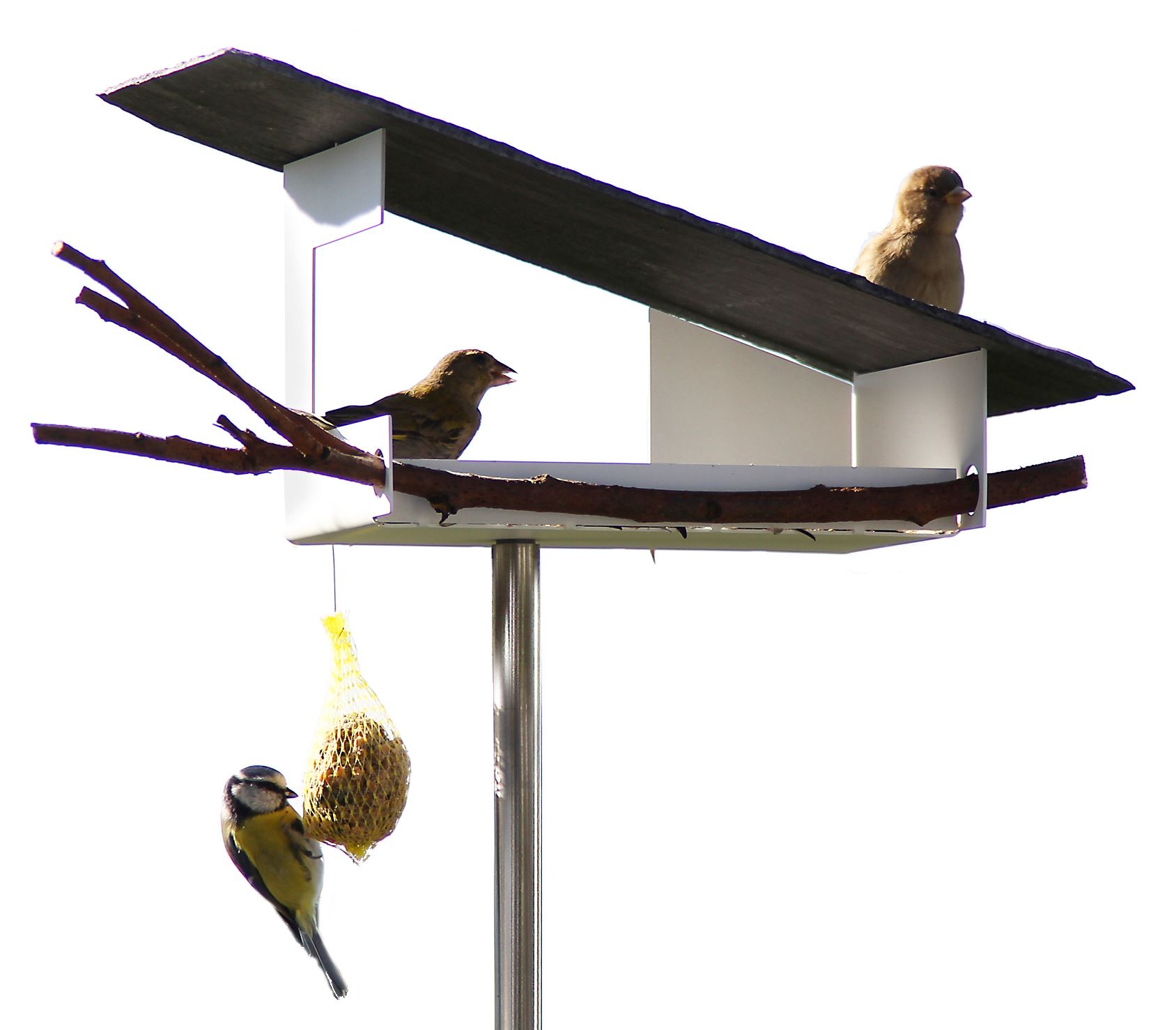 Unser modernes Vogelfutterhaus aus Edelstahl mit Schieferdach. Das Metall ist hier weiß pulverbeschichtet