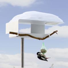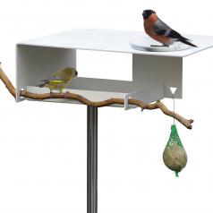 Eine Kombination von Futterhaus mit kleiner Tränke im Dachbereich. Mit Bauhaus typischem Flachdach und in weißer Pulverbeschichtung