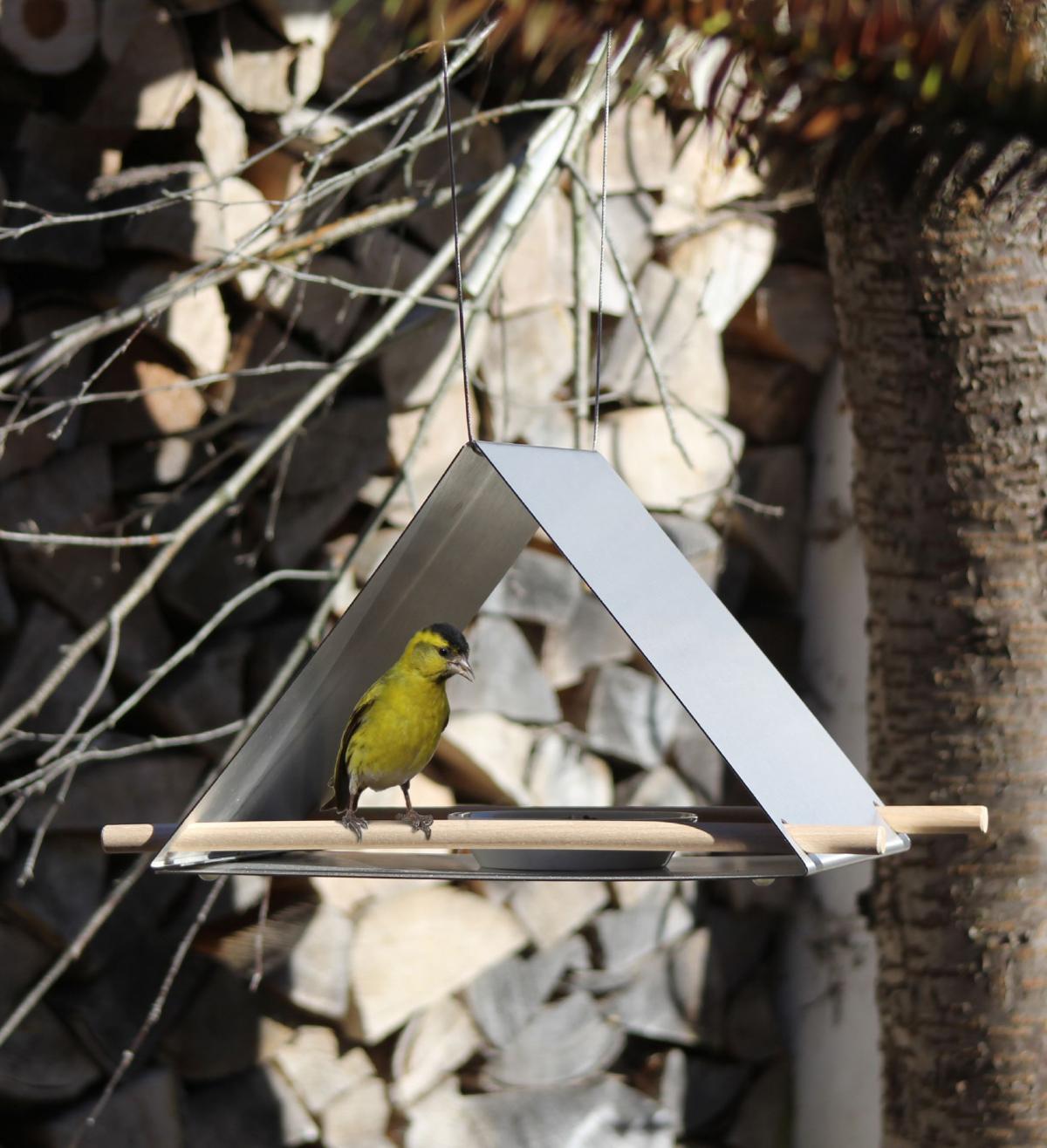 Unser VH-14 Edelstahlvogelhaus ist eine Neuauflage eines unserer ersten Designs, mit kleinen Detailänderungen. Dieses Vogelhaus in Nur-Dach-Form hat eine Grundfläche von 29 x 21 cm und wirkt trotz der seitlich geschlossenen Bauweise filigran. Zwei Buchenholzstege dienen als Landehilfe für die Vögel und schaffen eine Begrenzung nach vorn und hinten. Die enthaltene Porzellanschale kann sowohl für Vogelfutter (wie Sonnenblumenkerne) als auch als Tränke genutzt werden.