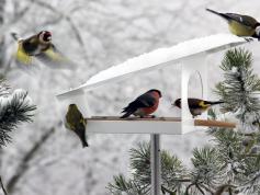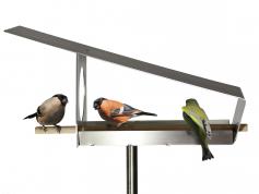 Diese Vogelfutterstelle ist katzensicher auf einem 1,5 Meter hohen Edelstahlstab montiert. Ein Edelstahlhaken für Meisenknödel kann optional dazu bestellt werden.