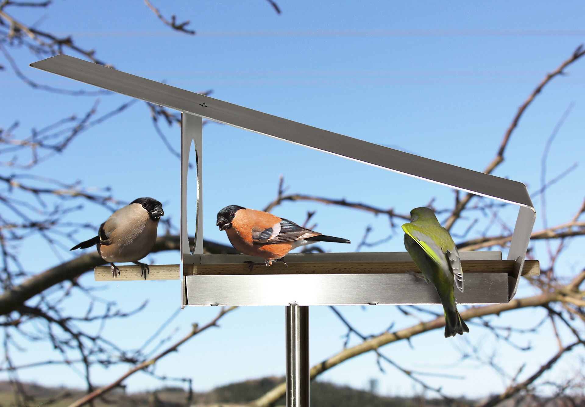 in schräges Dach, klare Linien und großzügige Öffnungen kennzeichnen diese minimalistische Futterstelle für Vögel. Gestalterisch an unser VH-6 mit Schieferdach angelehnt, ist diese Futterstelle aus einem einzigen Stück Edelstahl gefertigt. Ein Holzstab, der von vorn eingesteckt und selbst arretierend ist, dient als Landehilfe.