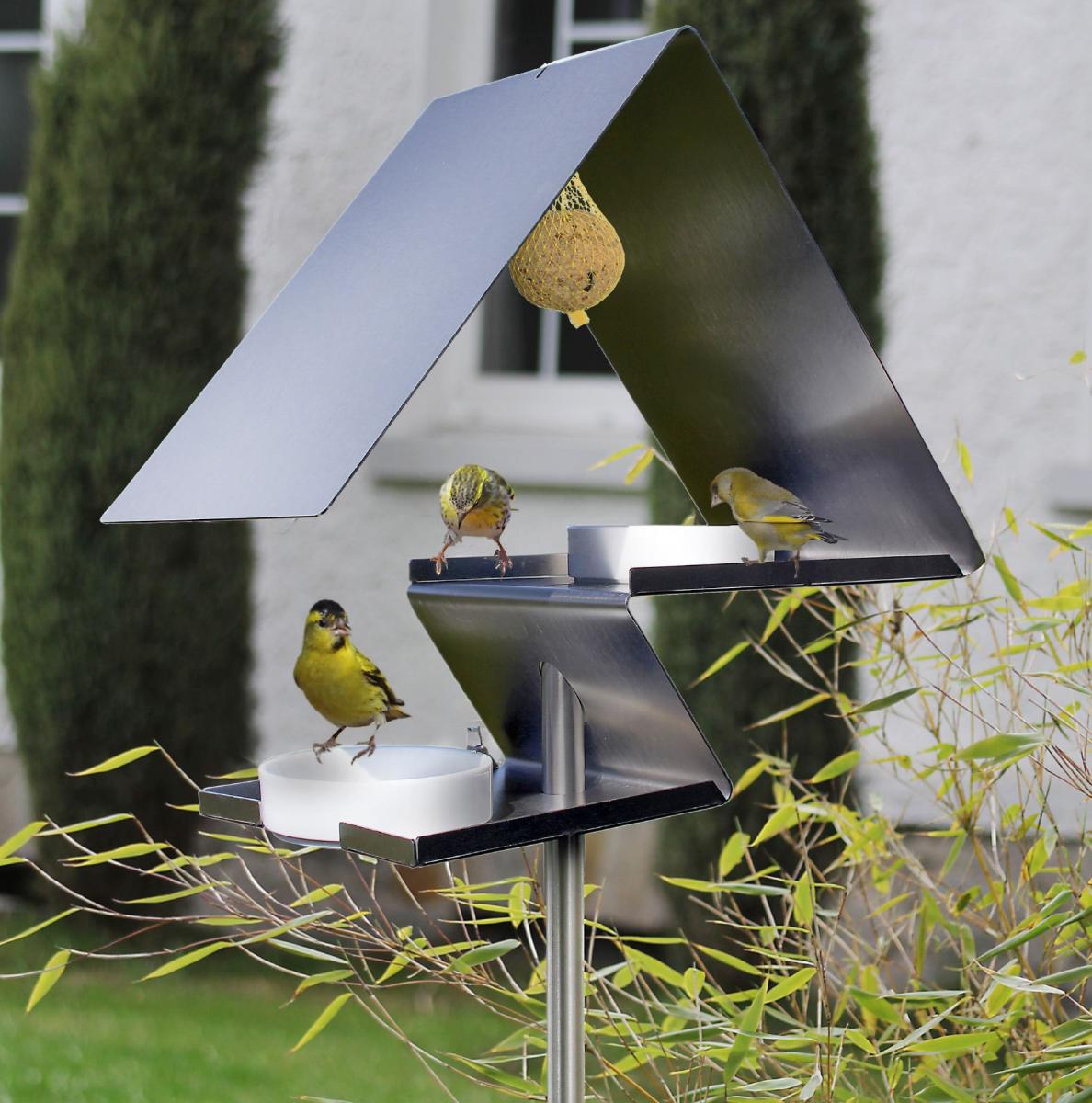 Durch die offene Gestaltung dieser kombinierten Vogeltränke ist das Futter leicht für die Vögel zu entdecken. Die zwei frostsichere Porzellanschalen werden mit Futter oder in den wärmeren Jahreszeiten mit Wasser gefüllt.