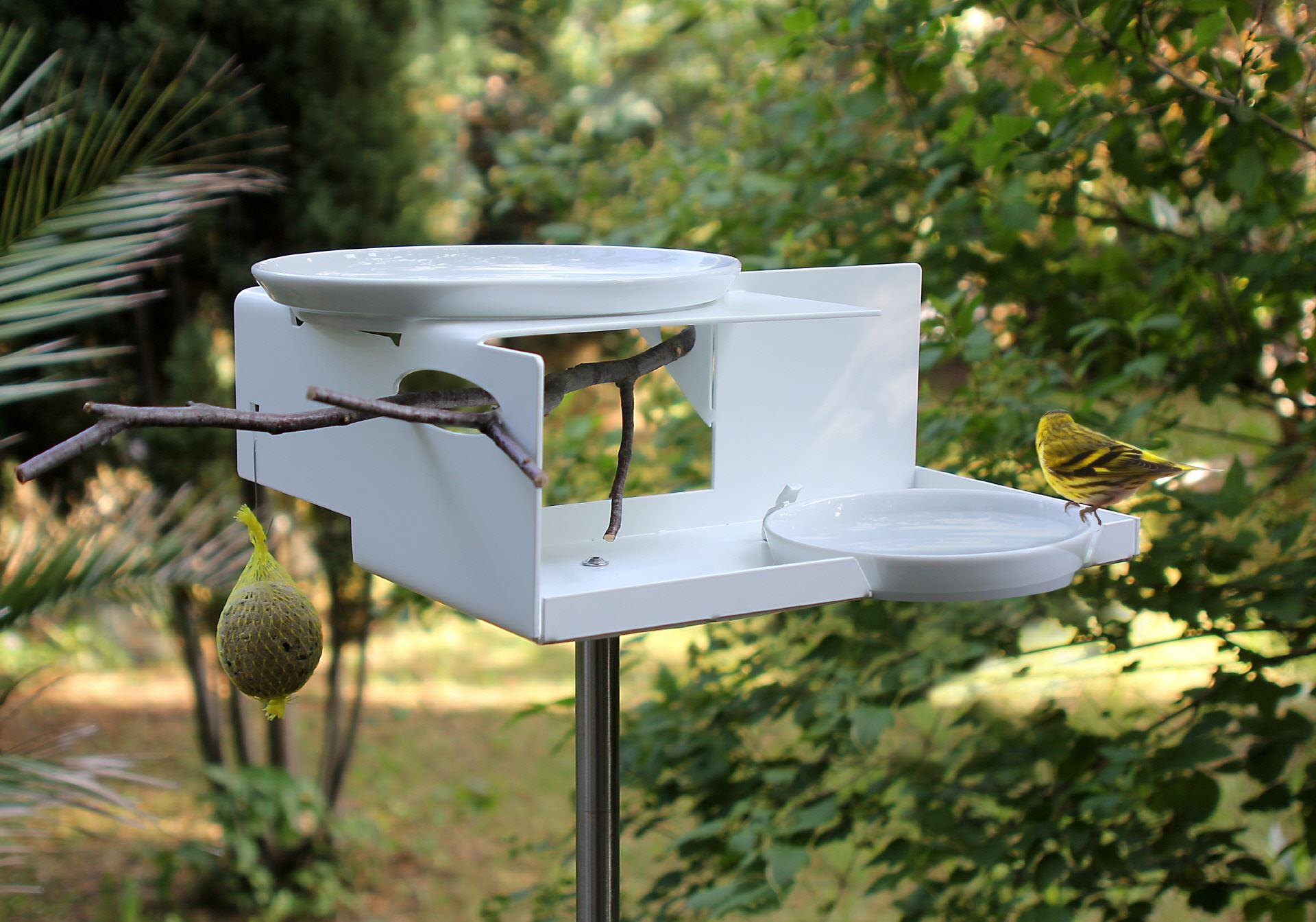 Eine Vogeltränke im Bauhaus-Stil, passend zu Häusern in moderner Architektur: Klassische Moderne trifft unvoreingenommene Vögel.