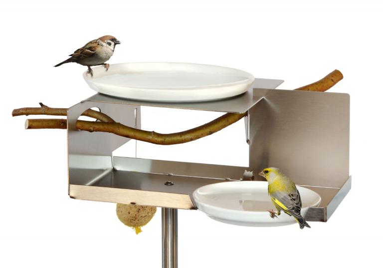 Klare, offene Formen, 2 Porzellanschalen und ein Ast als natürliche Landehilfe kennzeichnen diese im Bauhausstil gehaltene Vogeltränke mit zusätzlicher Futterstelle.